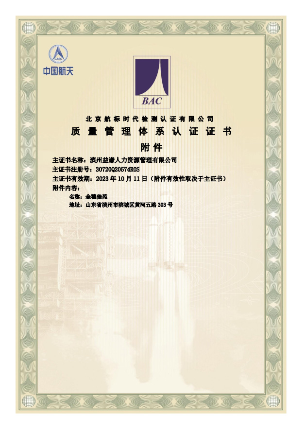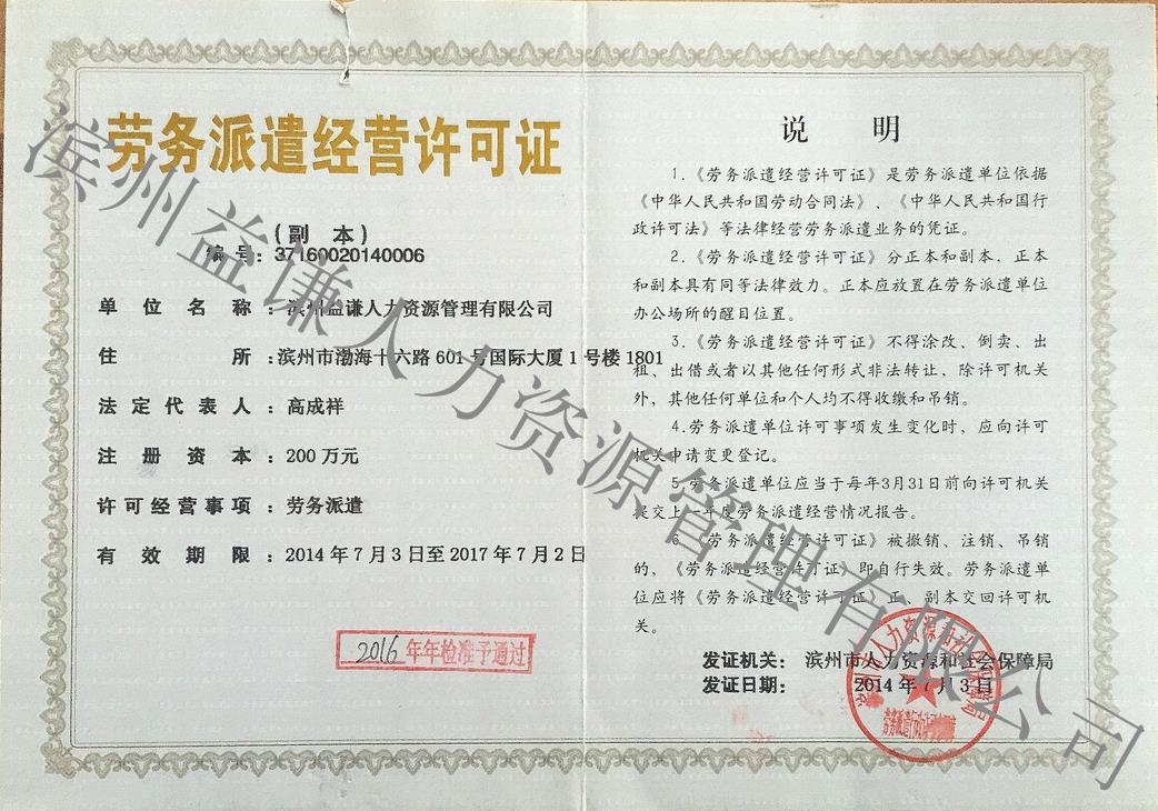 關(guān)于我們濱州益謙人力資源管理有限公司是經(jīng)工商行政管理機(jī)關(guān)依法批準(zhǔn)設(shè)立,并由人力資源和社會(huì)保障局審驗(yàn),取得《勞務(wù)派遣經(jīng)營(yíng)許可證》和《人力資源服務(wù)許可證》,現(xiàn)注冊(cè)資本500萬(wàn)元,員工16人,其中取得人力資源師資格的員工6人,并配備專(zhuān)職財(cái)務(wù)和法務(wù)人員。成為更專(zhuān)注于人力中介  努力打造“就業(yè)、培訓(xùn)、派遣、維權(quán)”一條龍服務(wù)模式,為眾多家企事業(yè)、機(jī)關(guān)單位派遣用工3000余人,是濱州市優(yōu)秀人力資源服務(wù)品牌。獲得了良好的口碑,積累了豐富的經(jīng)驗(yàn)。為成為更...