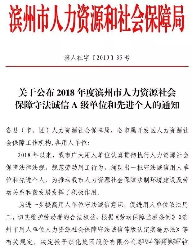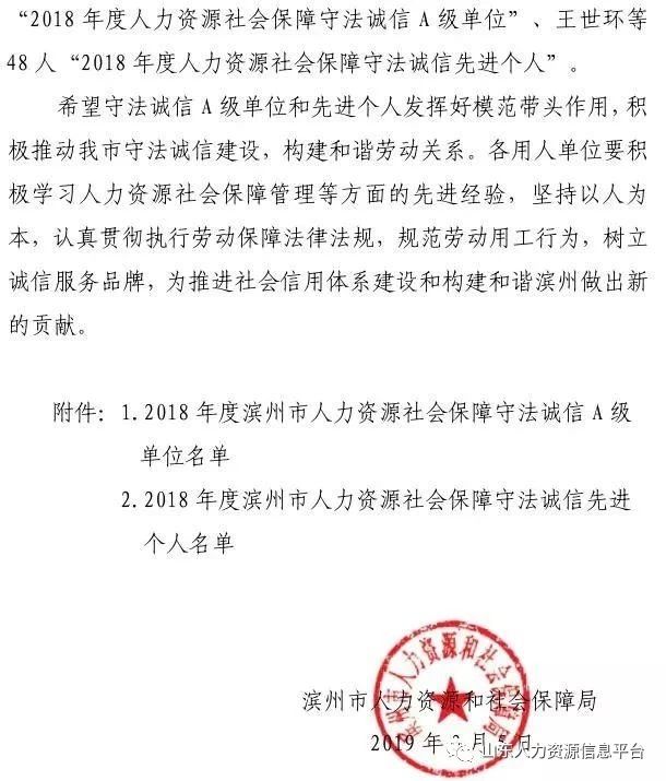 近日,濱州市人力資源和社會保障局對“2018年度人力資源社會保障守法誠信A級單位”進行了綜合評定,濱州益謙人力資源管理有限公司等54家用人單位榜上有名,王世環(huán)等48人被評定為“2018年度人力資源社會保障守法誠信先進個人”。