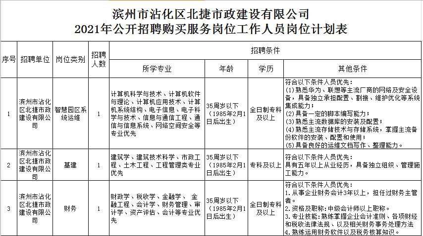 根據(jù)實際情況,經(jīng)研究決定,現(xiàn)將公司于2021年2月3日發(fā)布的《濱州市沾化區(qū)北捷市政建設(shè)有限公司2021年公開招聘購買服務(wù)崗位工作人員簡章》進行調(diào)整: